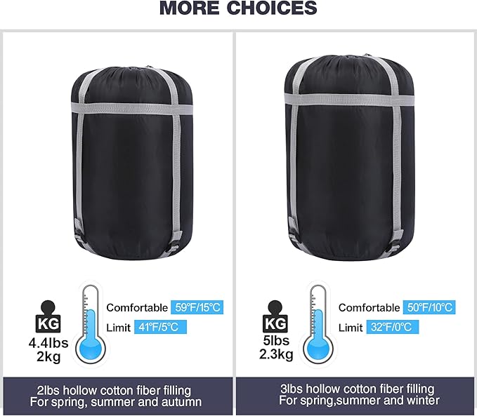 - TEMPERATURE RANGE: 3lbs filling sleeping bags is comfort in 41°F(0 degree cold weather) and fits temperature range 32-50 °F/0-10 °C. Females are recommended to choose the thicker sleeping bags. 2lbs filling sleeping bags fits temperature range 41-59 °F/5-15 °C.