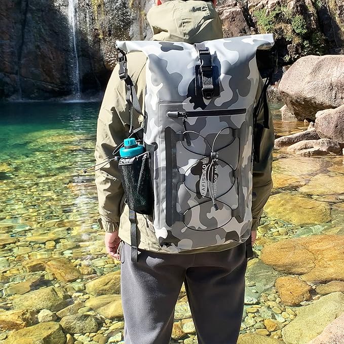 - ROLL-TOP CLOSURE: The roll-top closure system creates a watertight seal by rolling down the top of the backpack and securing it with the buckle. This closure method ensures maximum protection against water infiltration, making it suitable for water activities where the bag may be exposed to splashes or submersion.