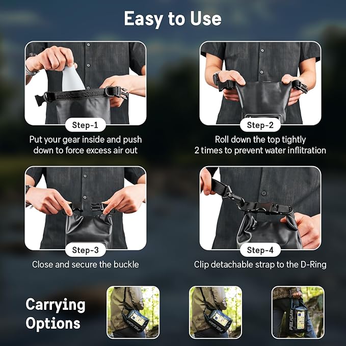 - Package Contents: 1 Unit of 5L Pelican Waterproof Dry Bag - Marine Series Stealth Black + (1) Detachable Keychain Lanyard; 1-Year Warranty