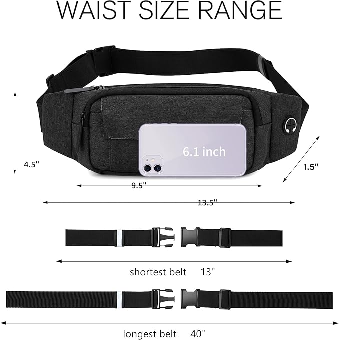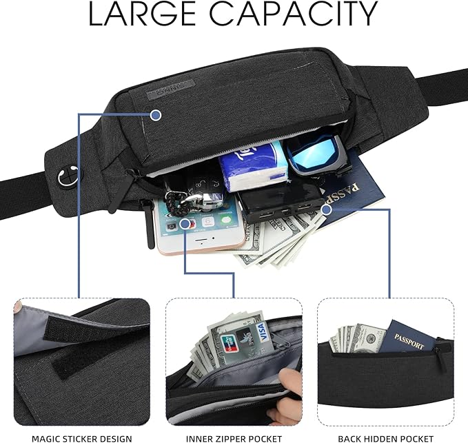 - 【Large Capacity】Our fanny pack size is about 10"x 2.5" x 4.5" inches and has 5 zippered pockets.Large fanny pack can carry all sizes of smartphones, keys, cash, cards, headphones, passports and small valuables.