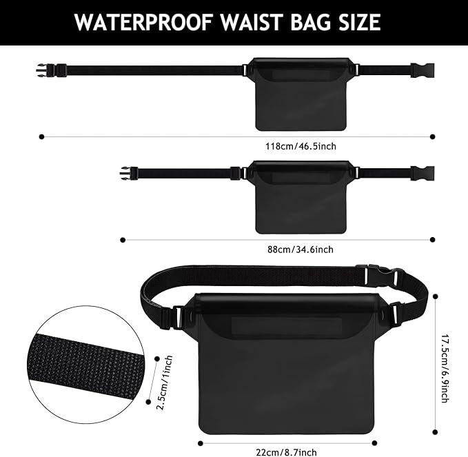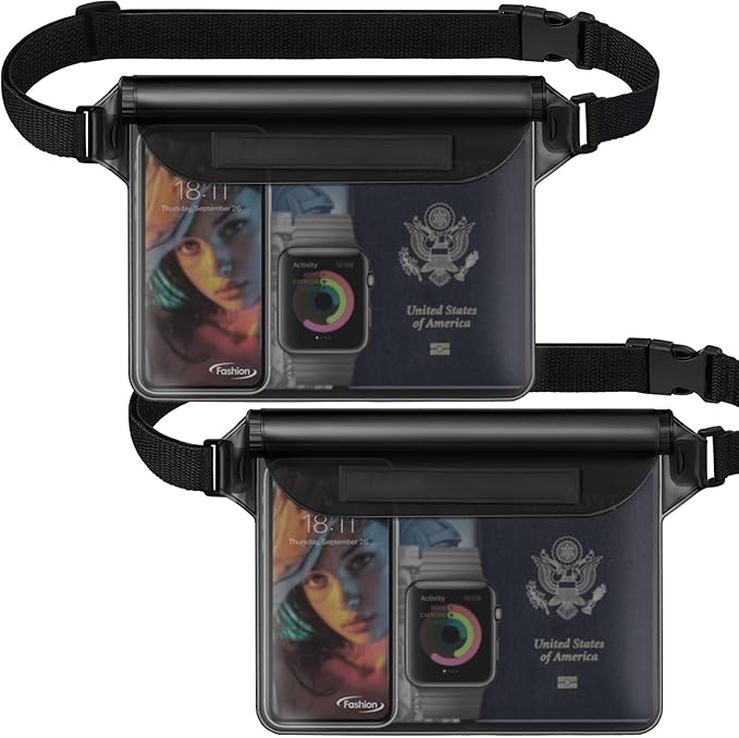 Hatisan Waterproof Pouch with Waist Strap, Waterproof Fanny Pack Keep Phone Valuables Safe and Dry Beach Accessories for Vacation Boating Swimming Snorkeling Kayaking Pool(2 Pack,Black)