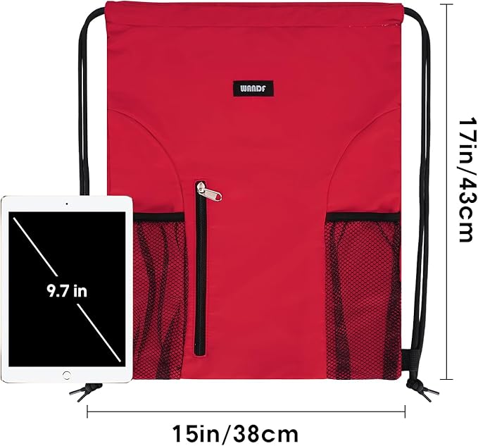 - LARGE CAPACITY--- WANDF drawstring backpack for men&women with large compartment measures 15" x 17", which is big enough for basketball, gym clothing, sport towel, ipad, textbooks and daily supplies. Two mesh side pockets can be used to hold your water bottle and umbrella.