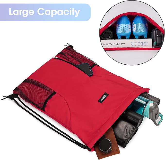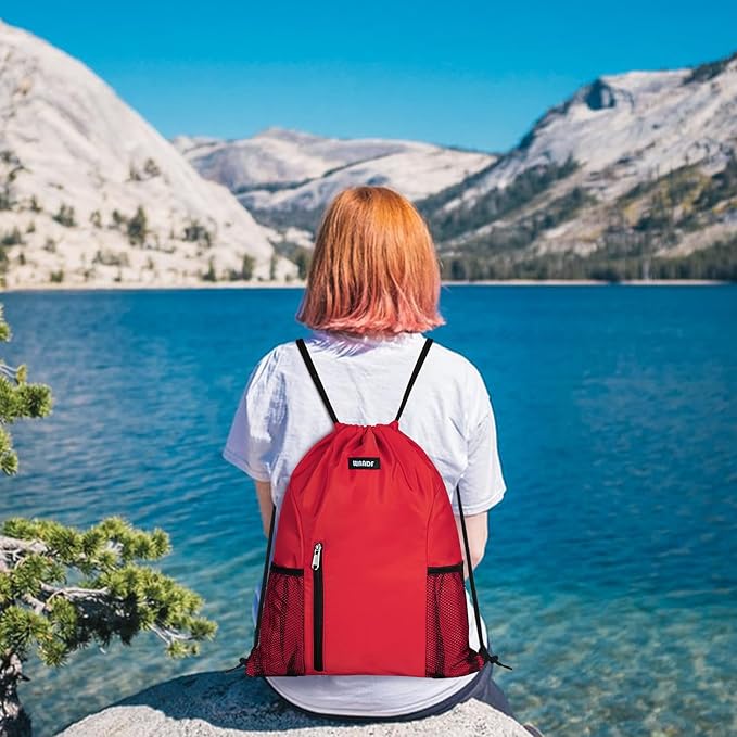 WANDF Drawstring Backpack Sports Gym Sackpack with Mesh Pockets Water Resistant String Bag for Women Men (Red)