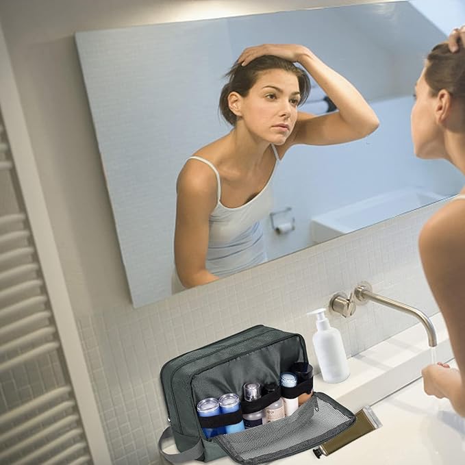 - 【ORGANIZED COMPARTMENTS】 --- Main compartment that holds larger items such as shampoo bottles or shaving cream. One zippered mesh pouch that keeps your smaller toiletries and cosmetics in a place visible and breathable. Other side front zipper pocket that provides extra storage with easy.