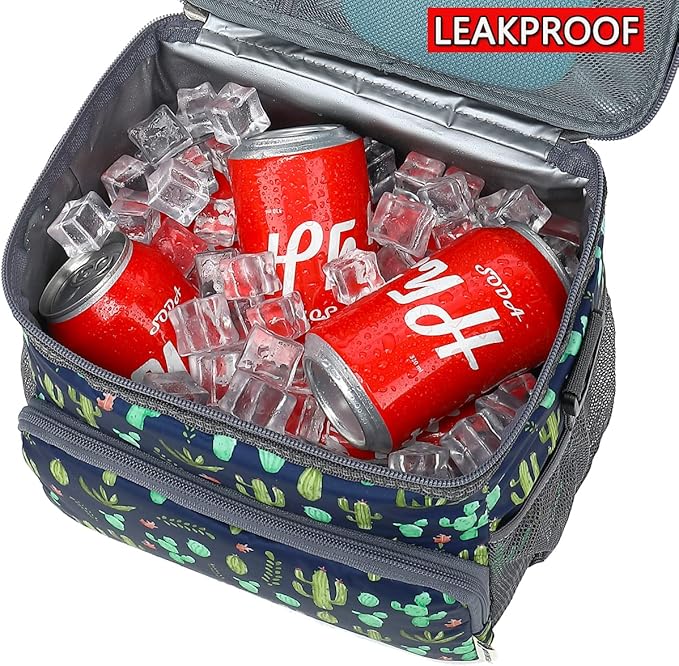 Insulated Reusable Lunch Bag Adult Large Lunch Box for Women and Men with Adjustable Shoulder Strap,Front Zipper Pocket and Dual Large Mesh Side Pockets,Cactus