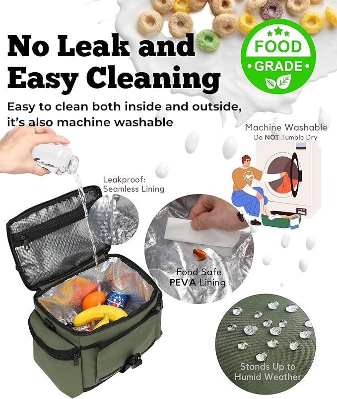 - Easy to clean and leakproof - The exterior is made of a high-density fabric that is rain-resistant and tear proof. Water beads up on the surface, keeping the bag dry even in wet conditions. While the inner PEVA lining is non-porous and seamless that doesn’t let liquid through, so you won’t have leaks or spills. If you do spill something, like soup, oil, or tomato sauce, it's easy to clean up.