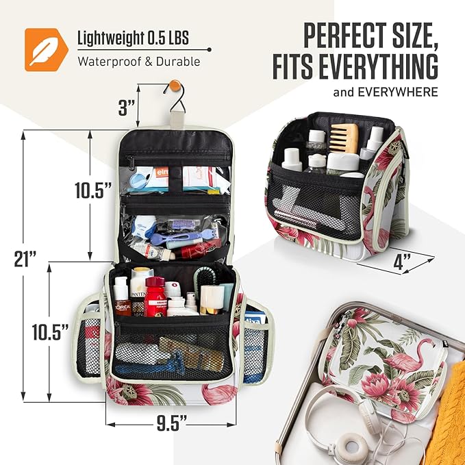 VENTURE 4TH Hanging Travel Toiletry Bag for Women & Men - Travel Organizer with Expandable Compartments & Removable Clear Pouch for Toiletries (Pink Flamingo)