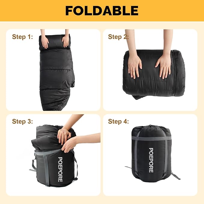 - More Spacious: POEPORE sleeping bag has dimensions of (78.74+11.81)*35.43 inches and a packed size of 16.53*13.38*5.51 inches. The sleeping bag features an enlarged and widened design, providing ample space that suits various body types, including even XXL sizes, allowing freedom of movement and ensuring comfort.