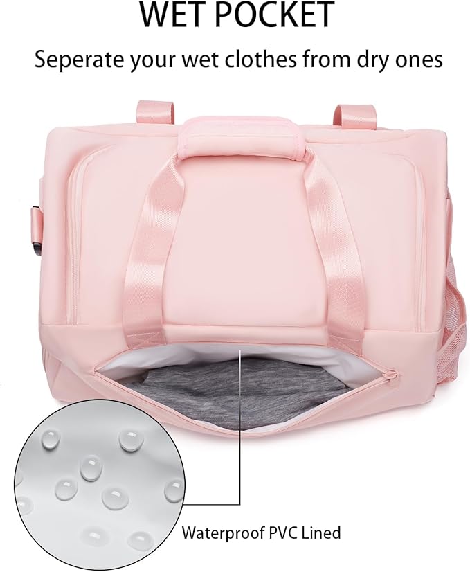 • DRY & WET SEPARATION: The small gym bag for women is well thought out with a dry & wet compartment separation. It uses waterproof PVC lined with smooth zipper closure, good for storing wet clothes and swimsuits. Workout will be a breeze with this gym bag.
