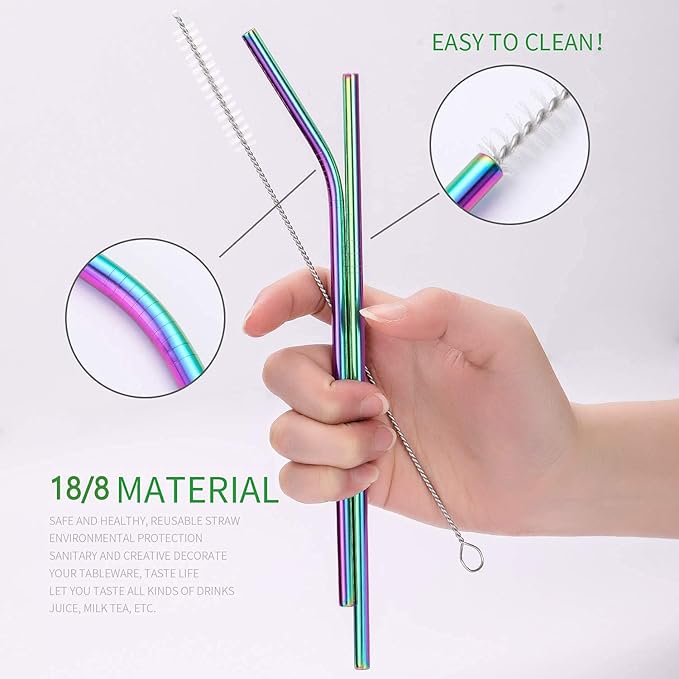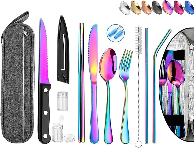 - 《Multi-function combination》Travel Rainbow Silverware set with case- includes knife,a special included sheathed steak knife,fork,spoon with travel chopsticks, easy-carry zipper-bag.two mini spice jars and a portable straw set ( straight straw and bent straw with silicone tips)