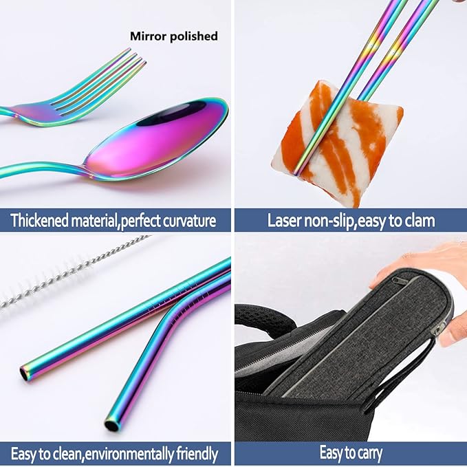 Portable Reusable Travel Utensils Silverware With Case, Camping Cutlery Set, Chopsticks and Straw, Flatware With Case, Stainless Steel Rainbow Top