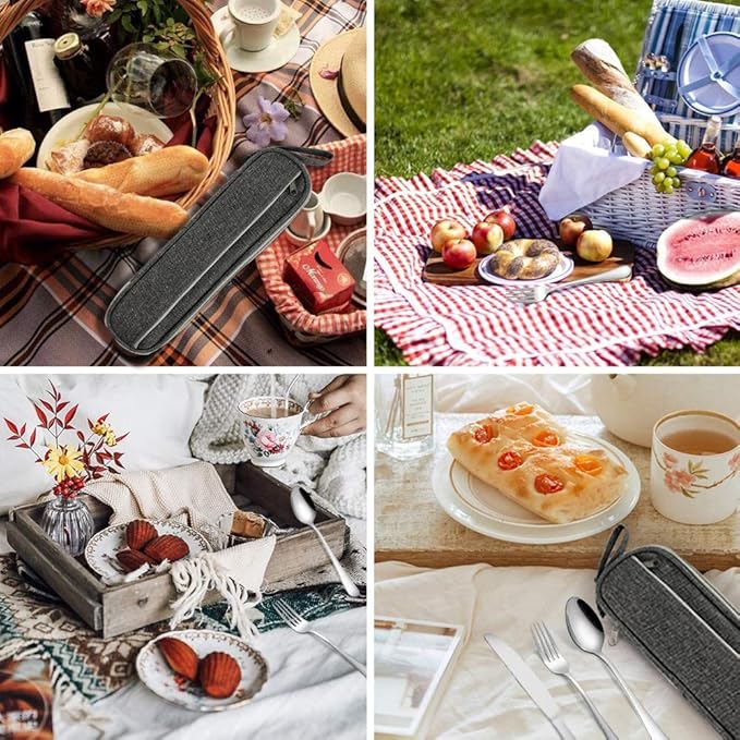- Portable & Stylish - Not only design for convenience, but also with simple elegance. The adult-sized portable cutlery set fits easily into the modern gray case. Convenient to carry with the tricolor belt and zip up the reusable travel silverware with ease. The sharper knife edge, round designed spoon and super sturdy fork provide you a pleasant experience to use this portable flatware.