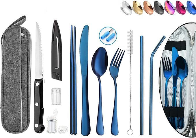 - 《Multi-function combination》Travel Blue Silverware set with case- includes knife,a special included sheathed steak knife,fork,spoon with travel chopsticks, easy-carry zipper-bag.two mini spice jars and a portable straw set ( straight straw and bent straw with silicone tips)
