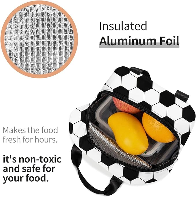 VOOHDDY Football Soccer Ball Black White Insulated Lunch Bag For Men Women Reusable Lunch Box Container Waterproof Portable Cooler Thermal Tote Bag For Work Office Picnic Beach Travel
