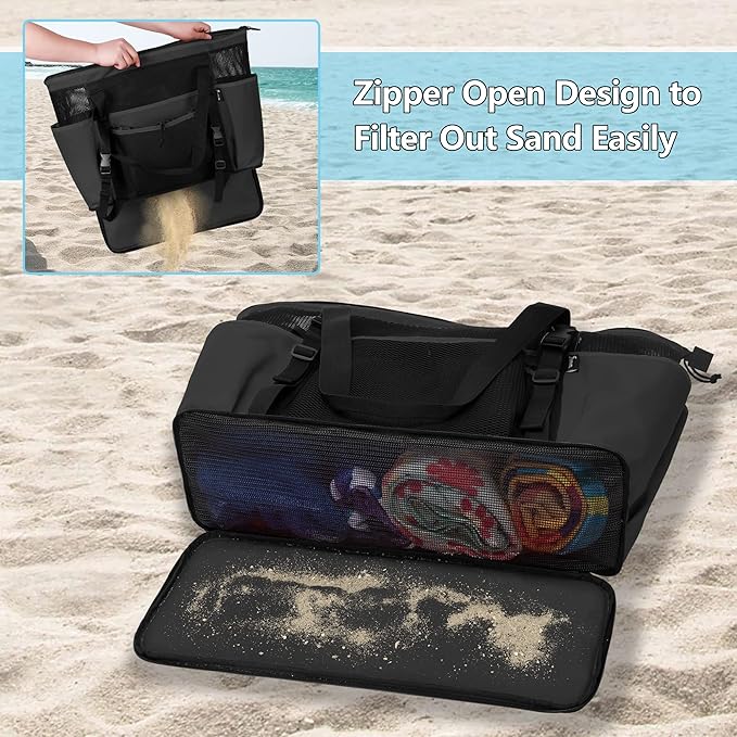 - Features bottom zipper opening design makes it easy to shake sand out quickly. Built-in water-resistant translucent pocket inside to store wet swimsuits. Front buckle straps can keep towels or beach blanket.