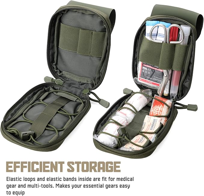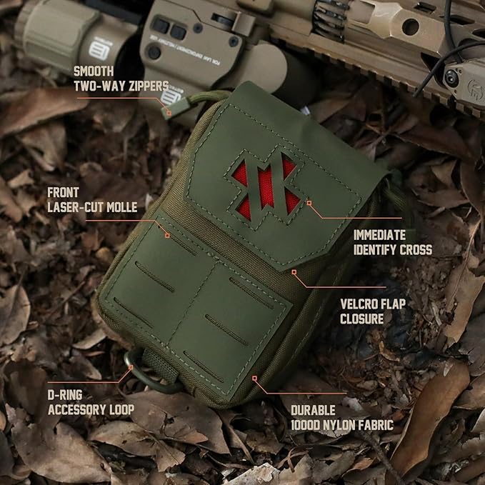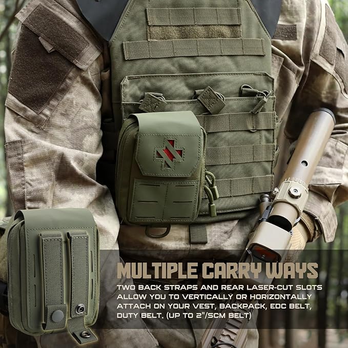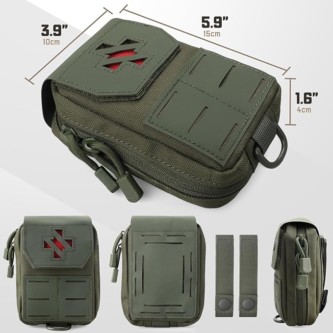 - MOLLE & BELT COMPATIBLE: First Aid Pouch equips two Molle back straps to fit any Molle/PALS system(like carrier vests or tactical backpacks), can be also mounted vertically and horizontally on the duty belt. The front laser-cut MOLLE platform attaches additional small gears you need for easy-to-reach.