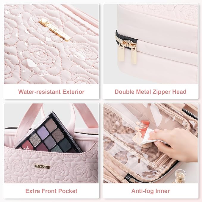 - STAY ORGANIZED & EASY ACCESS: This bag features 4 compartments, with multiple pouches designed for cosmetics securely holding small items; Elastic bands keep bottles upright; A front pocket offers additional storage and quick access to makeup essentials.