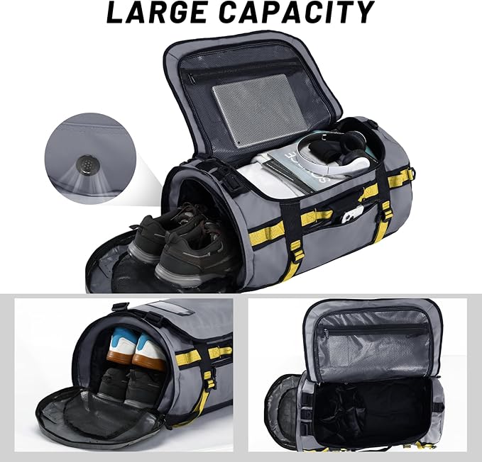 - Water Repellent Duffel ---- Built from heavy-duty water resistant tarpaulin and reinforced double layered tear-resistant floor panel, designed for harsh environments and features huge capacity to hold your workout gear or your trip stuffs. Best for hiking, camping, climbing, gym sports, car trip, traveling or other outdoor adventures