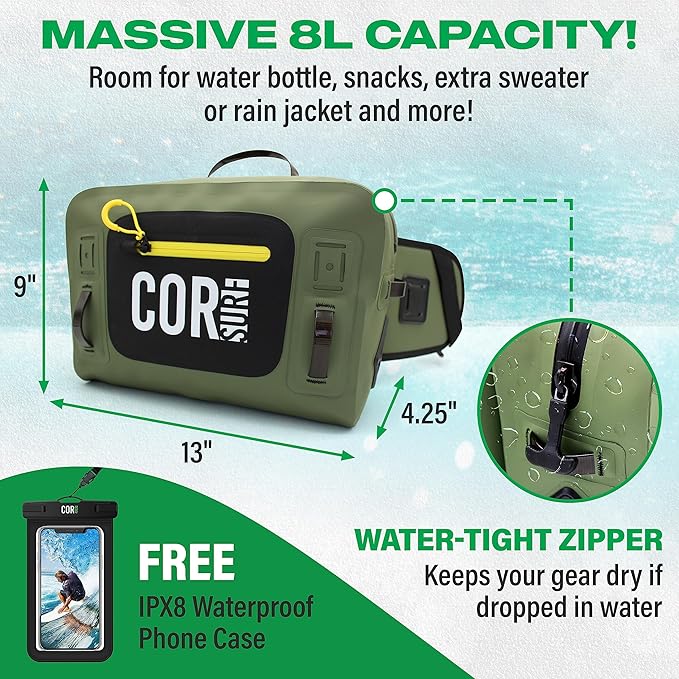 Waterproof Hip Pack | 8L Submersible Lumbar Fishing Waist Pack with Airtight Zipper | Perfect for Fly Fishing, Boating, Camping, Hiking or Paddleboarding | includes free IPX8 Waterproof Phone Case