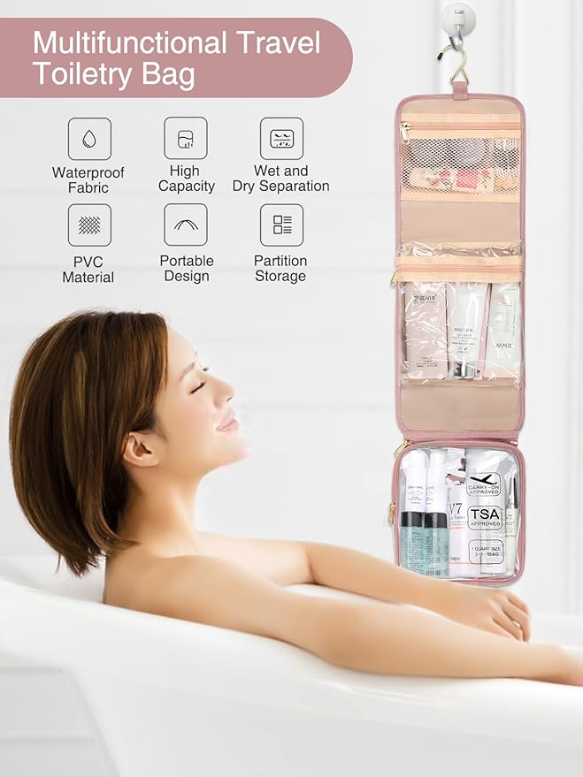 - Compact Toiletry Bag With Large Capacity: 3 separate compartments with zip for great travel organizer. Mesh Pockets for small travel items like hair products, nail polish, medicine, hygiene, etc...Hanging inner main pockets hold bottles upright, for travel essentials, travel-size toiletries, liquids, toothbrush, lotions, shampoo, shaving dopp kit. Small clear travel bags for TSA liquids,travel make up, Jewelries or electronic products