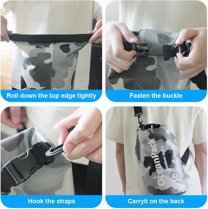 • Easy to Use and Clean: No complicated procedures here! Simply place your gear inside the dry bag, roll down the top woven tape tightly 3 to 4 times, and secure it with the buckle for a complete seal. Cleaning is a breeze too just wipe the smooth surface with a rag and it's good as new