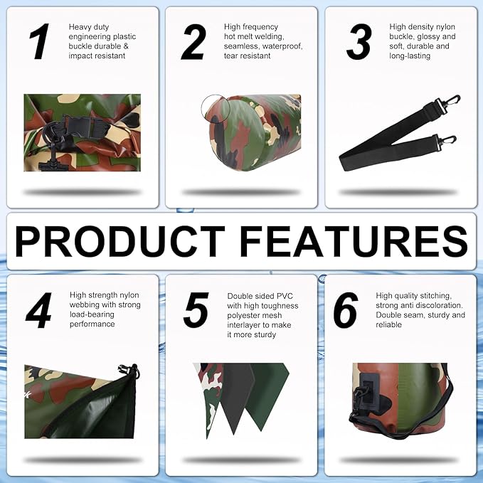 - High Quality Material:Our Waterproof Dry Bag, made from high-quality 500D PVC material, ensures a reliable and durable waterproof seal to keep your valuables safe and dry during kayaking, paddleboarding, or any water activities. Say goodbye to worrying about water damage! Comes with an extra waterproof phone pouch for phones up to 7 inches