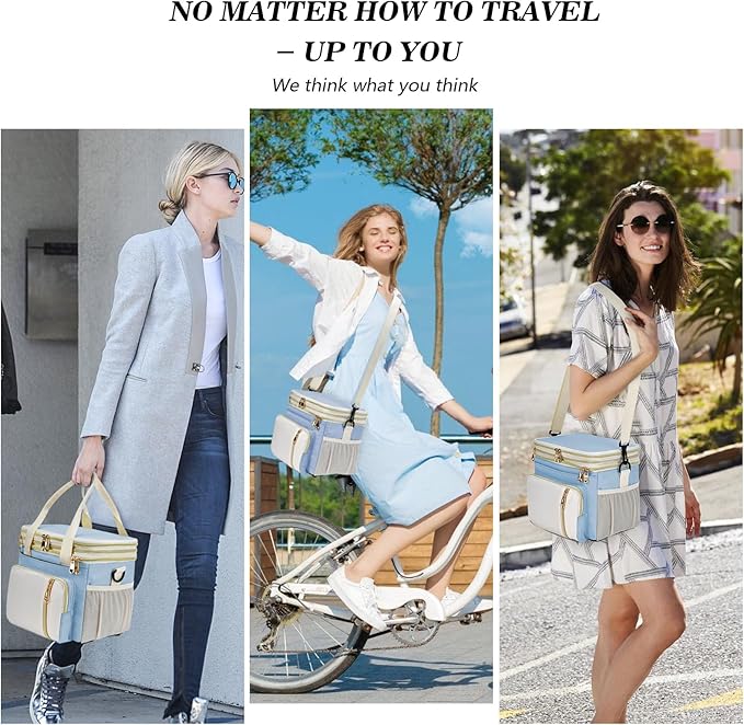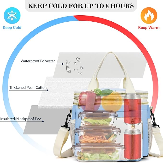Lunch Box & Lunch Bag for Women, Large Insulated Adult Lunch Box Leakproof Lunchbox Cooler Bag for Work Picnic Beach,16L, Sky Blue & White