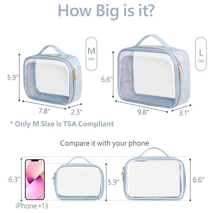 PACKISM Floral Texture Lace TSA Approved Toiletry Bag - 180° Large Opening Clear Makeup Bags in 2 Size, TSA Clear Toiletry Bag with Handle, 0.5 mm Thick Non-deformable No Smell, Blue