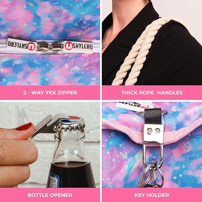 • ROOMY CAPACITY - sized at L22" x H15" x W6", there is plenty of space to securely store your wet beach towels, outfits, lotions, lipstick, cosmetics, magazines, other accessories. Sturdy and comfy rope handles make SHYLERO beach totes tremendous over-the-shoulder handbags for women