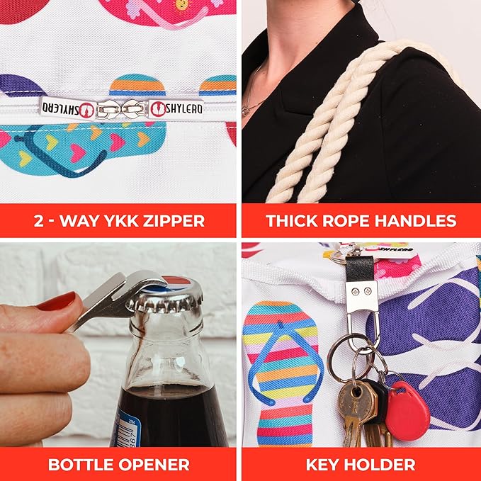 - ROOMY CAPACITY - sized at L22" x H15" x W6", there is plenty of space to securely store your wet beach towels, outfits, lotions, lipstick, cosmetics, magazines, other accessories. Sturdy and comfy rope handles make SHYLERO beach totes tremendous over-the-shoulder handbags for women