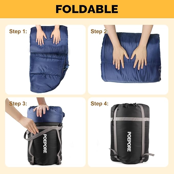 - Multiple Scenes: The sleeping bag comes with a compression bag, allowing easy rolling and convenient portability. Whether it's camping, traveling, outdoor adventures, or indoor overnight stays, the sleeping bag provides a comfortable sleeping environment. It also offers additional insulation in lower temperatures or harsh environments, protecting users from cold or damp conditions. Therefore, the POEPORE sleeping bag is an essential piece of equipment for outdoor enthusiasts and travelers.