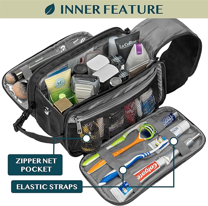 - LARGE OPENING TOILETRIES TRAVEL BAG: This toiletry bag organizer has double zipper design that allows for easy access to the large main compartment. With one simple pull on the handle, you can easily access key accessories such as shaving kit, tooth brush, and shampoo. This toiletry travel bag has the convenient design that helps you stay organized and makes this travel bag case an essentials during any traveling, flights, hotel stay, and weekend vacation.