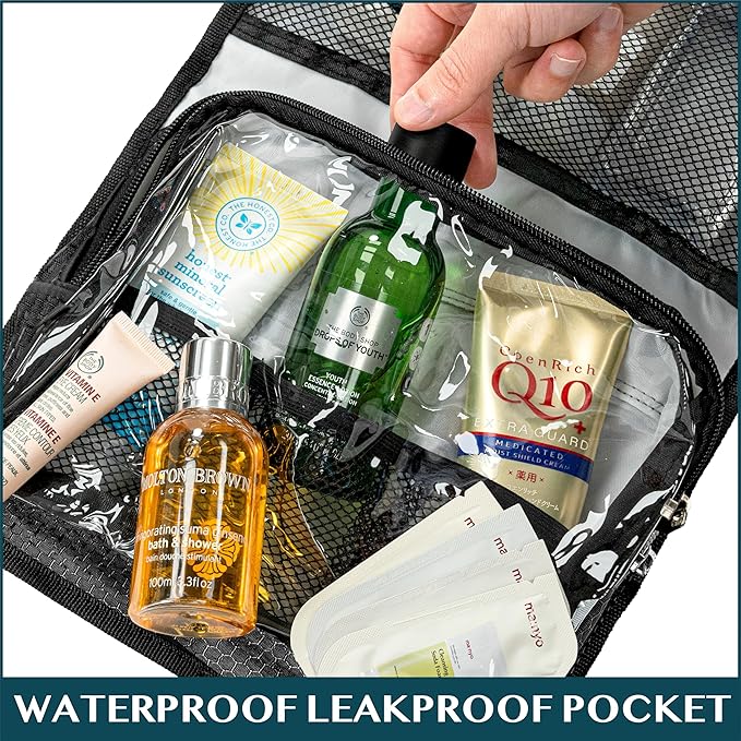 • PADDED MAKE UP BAG KIT: The toiletry case bag for men has foam padding that protects toiletries container, shampoo bottle during flying, roadtrip, and plane. The toiletry bag kit also has elastic bands that secure makeup brush, face spray, lipstick, shaving razors. One waterproof compartment for wet toiletries. Clear pockets let you see all essentials clearly and is tsa approved. This large hanging toiletry bag holder for women will protect all gear, cosmetics, and travel gadgets.