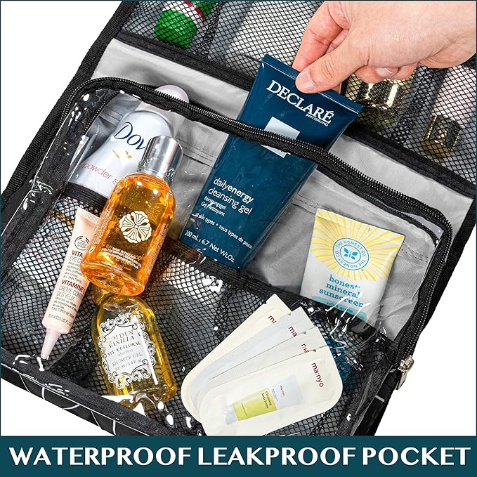 • PADDED MAKE UP BAG KIT: The toiletry case bag for men has foam padding that protects toiletries container, shampoo bottle during flying, roadtrip, and plane. The toiletry bag kit also has elastic bands that secure makeup brush, face spray, lipstick, shaving razors. One waterproof compartment for wet toiletries. Clear pockets let you see all essentials clearly and is tsa approved. This large hanging toiletry bag holder for women will protect all gear, cosmetics, and travel gadgets.