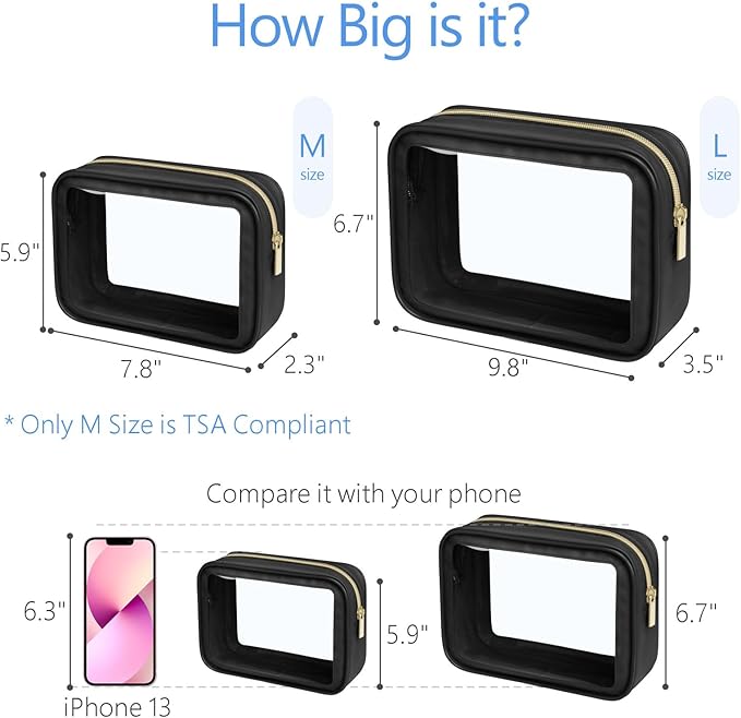 - TSA Approved Hassle-Free Pass: Adhering to TSA 3-1-1 rules for liquids, our clear travel bags (8.07 x 2.35 x 5.91 inches) promises a swift stroll through airport security. For items unfit for carry-on, the large-sized travel clear bag (9.84 x 3.54 x 6.69 inches) is perfect for checked luggage
