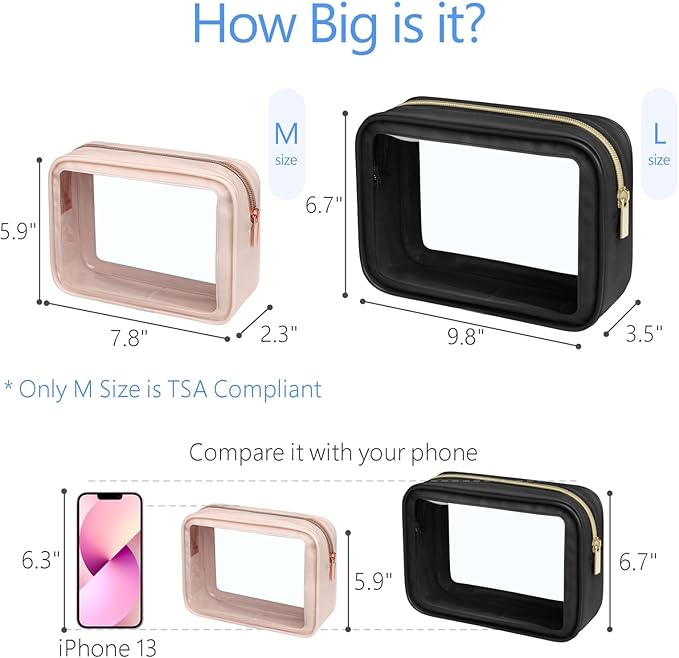 - TSA Approved Hassle-Free Pass: Adhering to TSA 3-1-1 rules for liquids, our clear travel bags (8.07 x 2.35 x 5.91 inches) promise a swift stroll through airport security. For items unfit for carry-on, the large-sized travel clear bag (9.84 x 3.54 x 6.69 inches) is perfect for checked luggage
