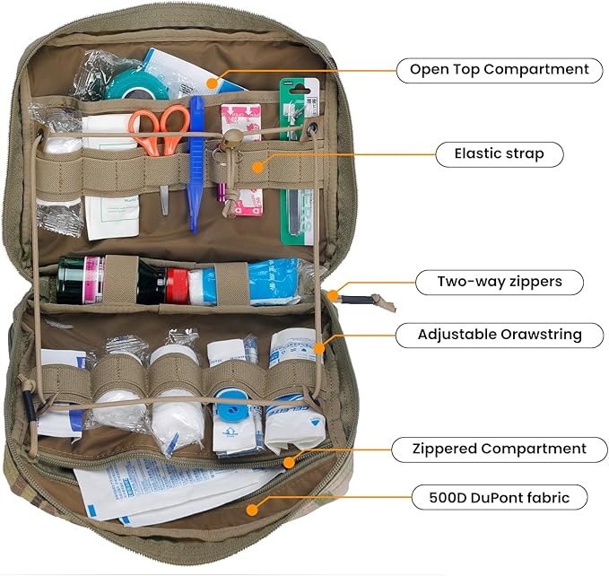 - PARTITION STORAGE DESIGN: EDC Utility Pouch has two main zipper pocket, each pocket has elastic loops and innner compartments that ensure your items well organized and strong loading capacity. It can storage a lot of tactical tools ,small gadgets,medical supplies or other a common use for easy access. The main compartment has paracord can open it flatly , you can hold in any position with the edge-to-edge retention cord.