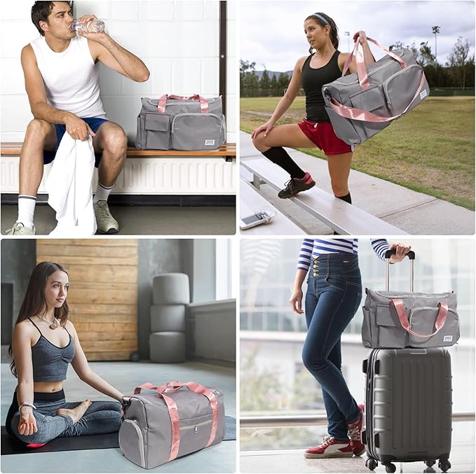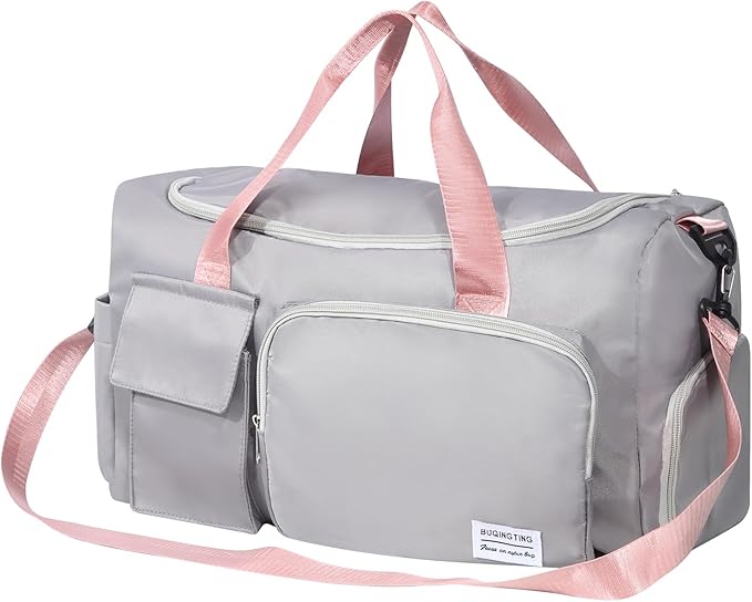 Duffel Bag for Gym Sports Workout Travel, Lightweight Waterproof Tote Bag with Shoes Compartment Wet Pocket for Women Grey with Pink Handles