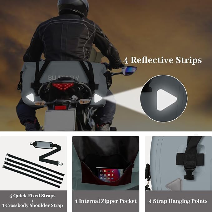 - Safe Design: The motorcycle duffle bag contains a total of 4 high brightness reflectors, which can provide you with good security protection for night travel. Comes with a removable shoulder strap and two side handles, you can carry it by hand or crossbody.
