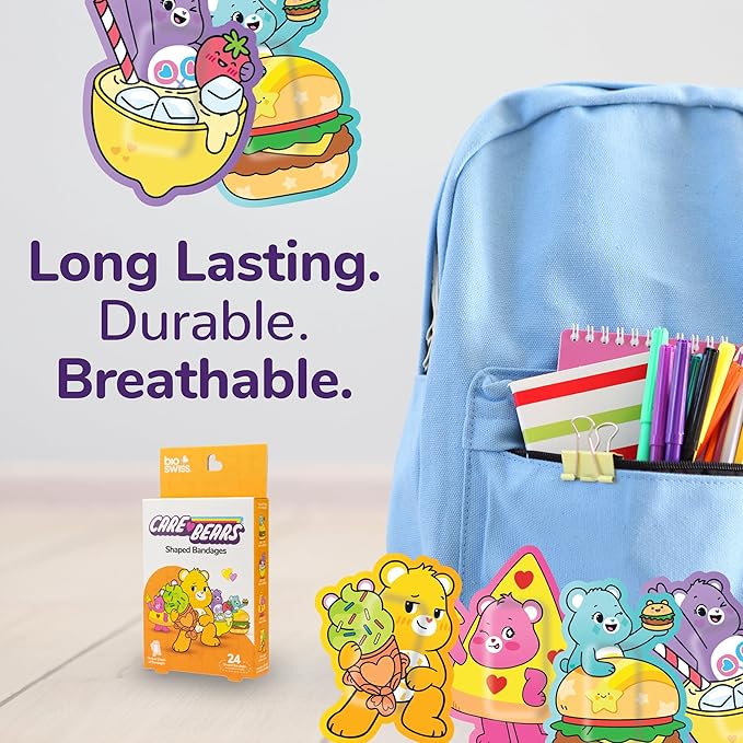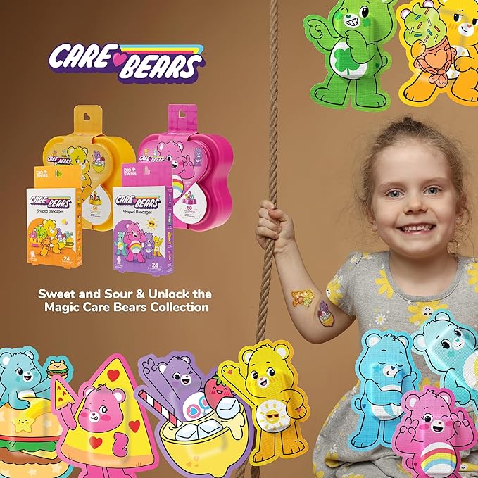 - CARE BEARS BANDAGES: This 24 piece pack of Care Bears bandages feature fun Wish Bear, Funshine Bear, Share Bear, and Cheer Bear shapes, and is great for putting a smile on kids' faces while protecting wounds such as cuts, scrapes, and burns; sticky bandages come in a cute cardboard box and are perfect for kids and adults alike, and also for school nurses and pediatric doctors