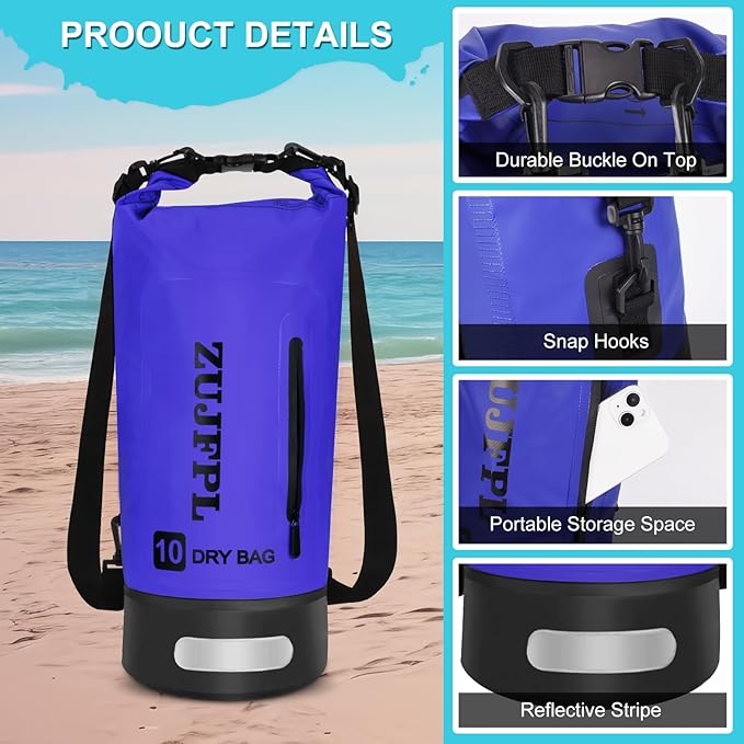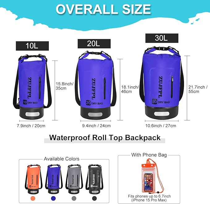 - 1. Versatile and Spacious: Our ZUJFPL Dry Bag Backpack is available in three different sizes (10L, 20L, 30L) to cater to your specific needs. With its ample storage capacity, it provides sufficient additional space for all your belongings, allowing you to carry everything you need for your outdoor adventures.
