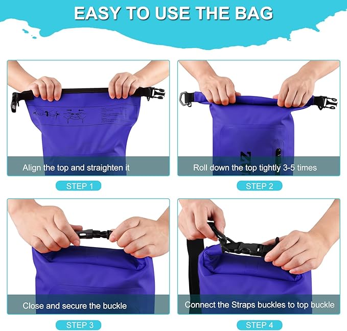 - 3. Reliable and Easy to Use: Featuring a large main compartment with a roll-top opening and closing mechanism, our Waterproof Dry Bag guarantees a secure and watertight seal. Simply place your items inside, fold the top 3-4 times, and buckle it up for ultimate protection against water, dust, mud, and more. Its user-friendly design allows for quick and effortless usage, saving you time and enhancing your overall journey.