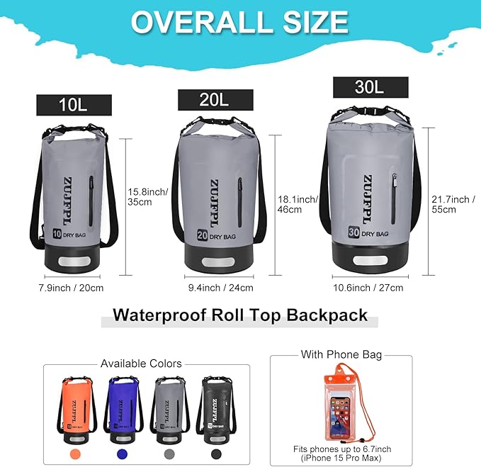 - 1. Versatile and Spacious: Our ZUJFPL Dry Bag Backpack is available in three different sizes (10L, 20L, 30L) to cater to your specific needs. With its ample storage capacity, it provides sufficient additional space for all your belongings, allowing you to carry everything you need for your outdoor adventures.
