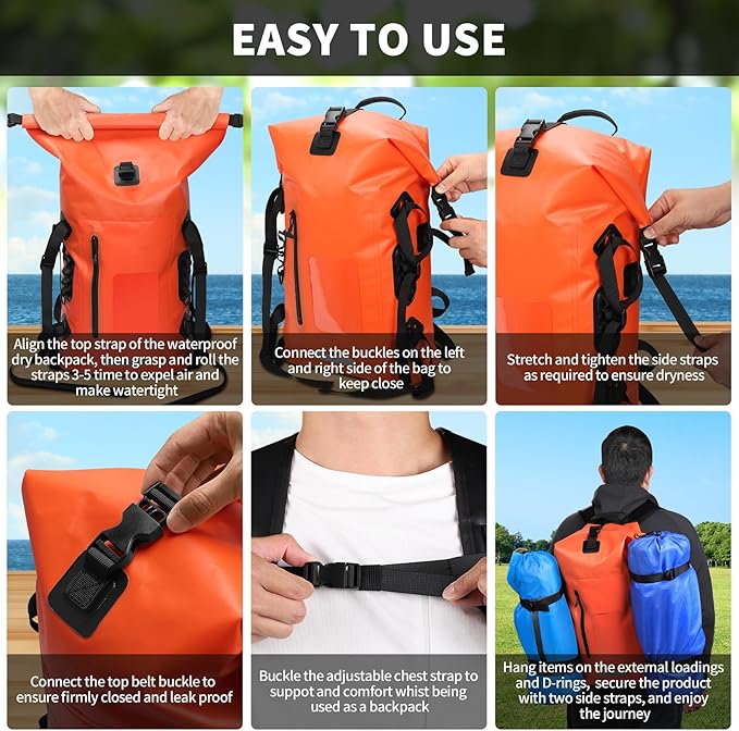 - 🚣【EASY TO USE】 Align the top strap of the waterproof dry backpack, then grasp and roll the straps 3-5 times to connect the buckles on both sides of the bag. Connect the top belt buckle, and tighten the straps to ensure dryness.