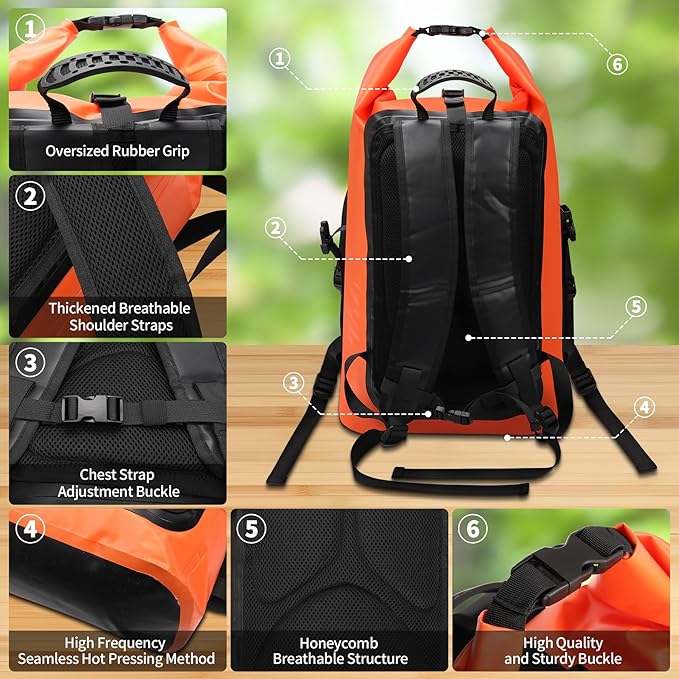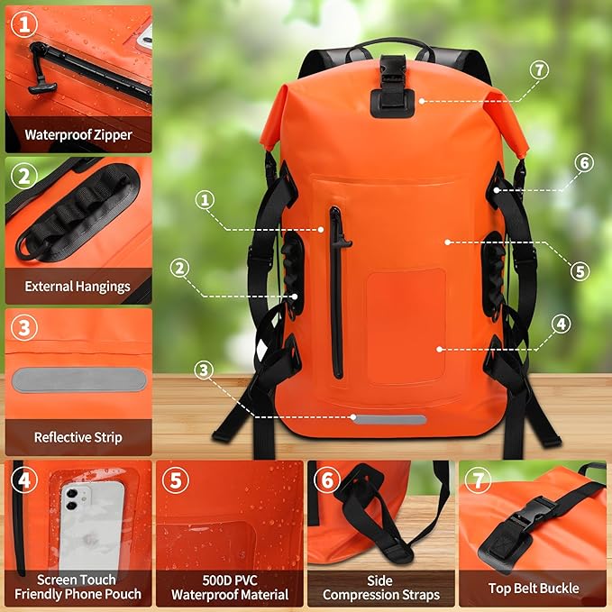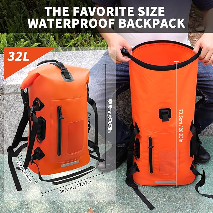 - 🏄【500D WATERPROOF MATERIAL】The 32L dry bag backpack is made of 500D PVC heavy-duty material, which is waterproof and scratch resistant. Adopting high-frequency seam bonding technology for tear and water resistance. The airtight waterproof zipper keep your essentials dry.