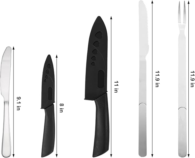 - TAILGATE READY: Upgrade your camping grill with this portable cooking utensil set! The camping cook set comes with 12-in tongs, a knife, fork, and marshmallow sticks that are perfect for campfires and camping grills.