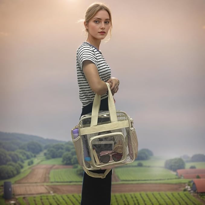 FlowFly Clear Bag for Stadium Events With Shoulder Strap for Women, Men, Large and Reusable Lunch Container, Work and Sporting Events, Travel 12x6x12 Clear Tote Bag, Clear#Biege