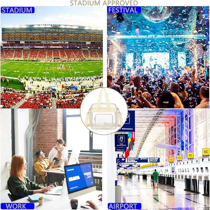 - Stadium Approved: FlowFly clear tote bags for women and men fully comply with the clear bag policy, adhering to the size limit of 12x12x6 inches. This makes it a suitable choice for venues such as stadiums, concerts, sports events, festivals, supermarkets, and more, facilitating easy and fast passage through security lines.