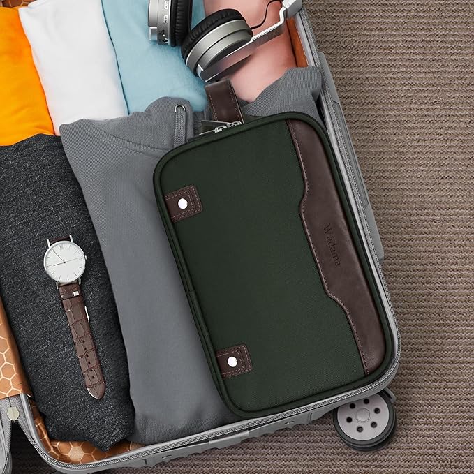 Wedama Toiletry Bag for Men, Medium Hanging Travel Toiletry Bag, Extra Electronic Organizer Bag Waterproof Shaving Bag for Toiletry with PU Handle for Travel Business Trips Swim Camping, Green+ Brown