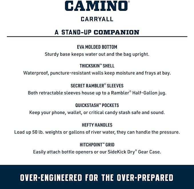 - MULTI-FUNCTIONAL - The waterproof, puncture-proof, Camino Carryall is designed for whatever the day throws your way. Perfect tote bag for the boat, lake, pool, beach, camping or road trips. Easy to haul your gear and easy to clean, the Camino Carryall is the last word in uncompromising convenience
